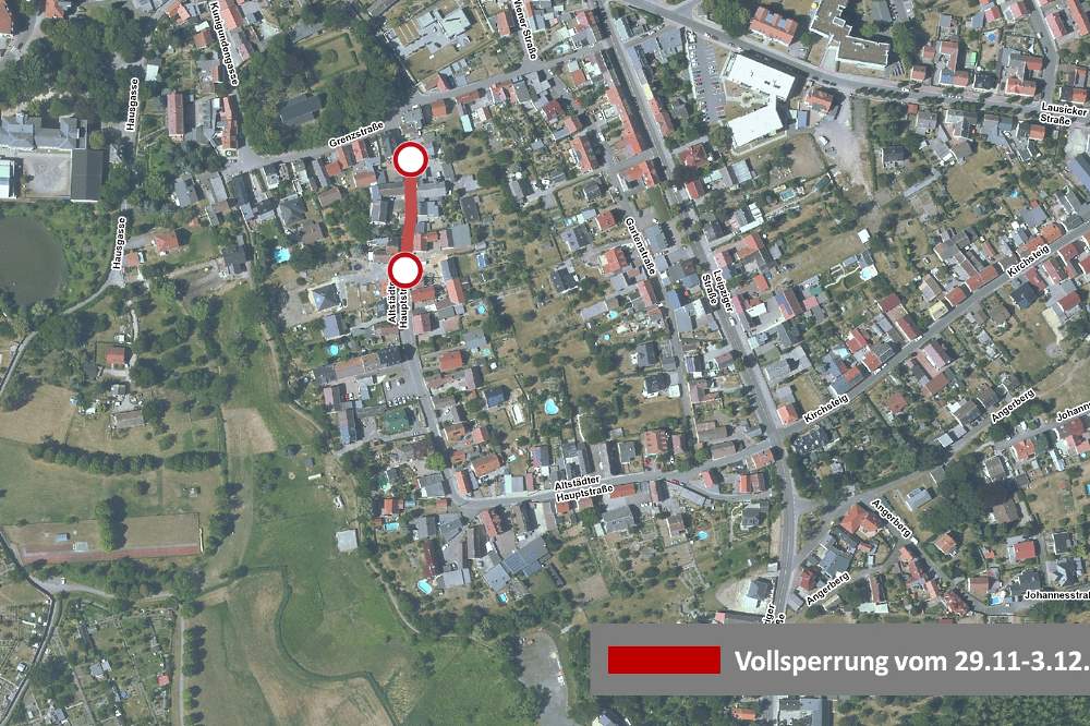 Im Auftrag der Städtische Werke Borna Netz GmbH werden ab Montag, dem 29. November in der Altstädter Hauptstraße Arbeiten am Gasnetz durchführt. Hierfür wird die Straße zwischen dem Abzweig Grenzstraße und dem öffentlichen Parkplatz voll gesperrt.