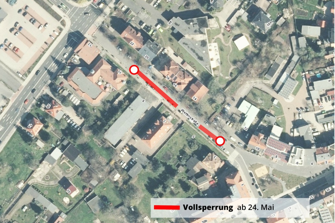 Ab Mittwoch, dem 24. Mai 2023 wird im Kreuzungsbereich Sachsenallee/ Wettinstraße/ Lobstädter Straße (B176) eine provisorische Ampelanlage in Betrieb genommen. Ab diesem Zeitpunkt ist die Einfahrt stadteinwärts in die Wettinstraße bis zur Hausnummer 11 bzw. 20 möglich.