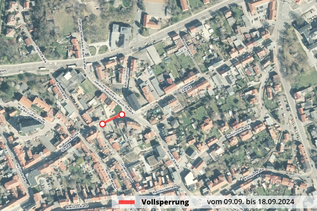 die Straße vom 09. bis 18. September 2024 vollständig gesperrt. Der innerstädtische Verkehr wird über die Grabengasse umgeleitet, wobei die Fahrtrichtung der Einbahnstraße vorübergehend geändert wird. Weiträumige Umleitungen führen über die Leipziger Straße und die Sachsenallee.