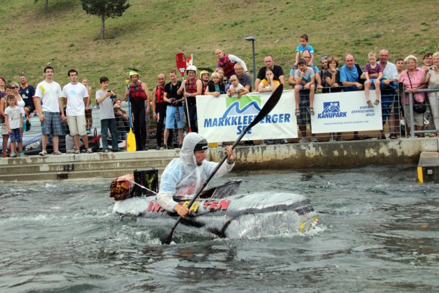 Insgesamt 16 abenteuerliche Teams stürzten sich beim 9. Pappbootrennen mit ihren Booten ins Wildwasser des Kanuparks. Zuvor wurde unter den Augen der Zuschauer eifrig mit Pappe, Cuttermesser und Klebeband an den fahrtüchtigen Kreationen gebaut. Drei Stunden hatten die Mannschaften Zeit, ihre Meisterwerke zu fertigen. Das anschließende Rennen für sich entscheiden konnten “Die Inspiraten” mit einer Bestzeit von 1:18 Minuten. Als Zweitplatzierter erreichte das Team “Blue Water” nach 1:35 Minuten das Ziel. Den dritten Platz belegte mit nur einer Sekunde mehr das Boot von den “Dorfnasen”.