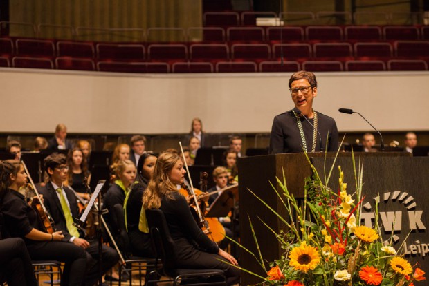 Nach dem Feierlichen Einzug des Senats begrüßte Rektorin Prof. Gesine Grande die neuen Studierenden: “Herzlich willkommen an unserer Hochschule für Technik, Wirtschaft und Kultur Leipzig. Ich wünsche Ihnen einen guten Start! Wir werden Sie engagiert unterstützen auf dem Weg zum erfolgreichen Abschluss Ihres Studiums”, so Rektorin Gesine Grande.