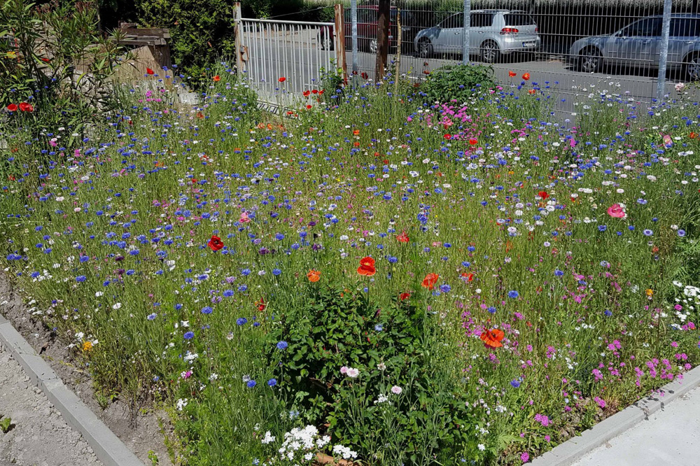 Mit einem „bunten Quadratmeter“ kann man ein kleines Stück Lebensraum schaffen und auch Schmetterlingen helfen, so wie auf diesem Firmengelände in Taucha. Samen dafür gibt es beim NABU Leipzig. Foto: Hans-Joachim Kietz
