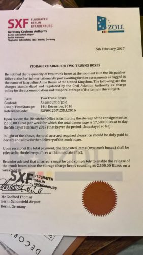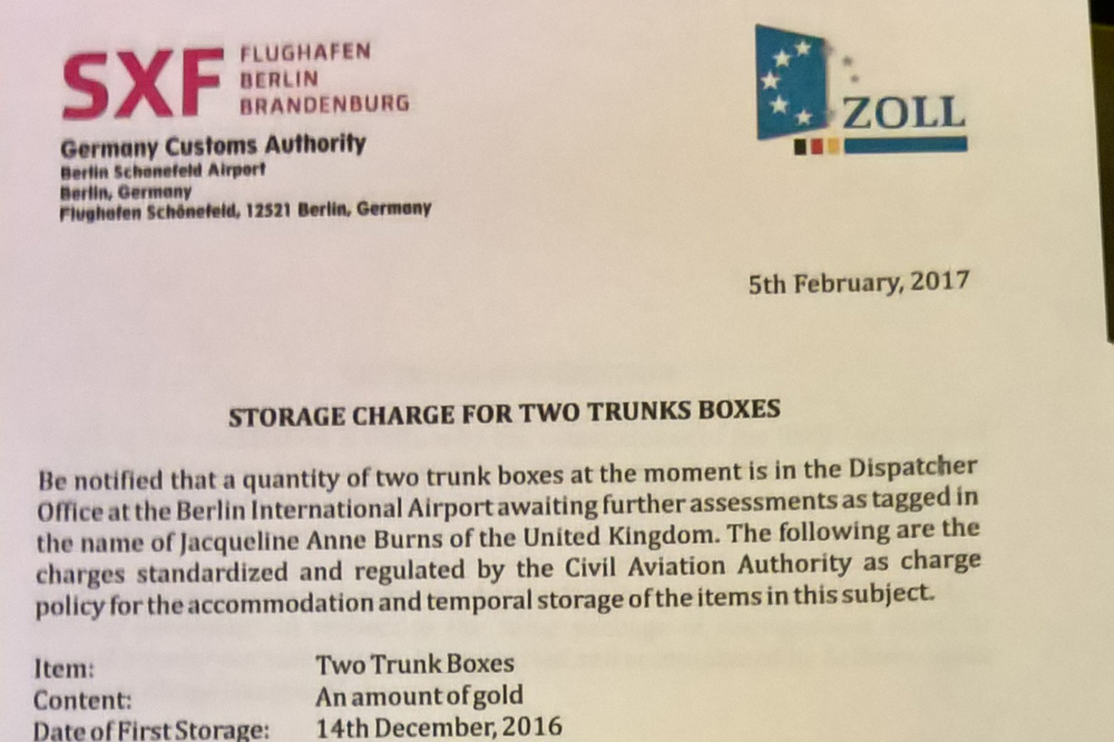 Bei einer weiteren Betrugsmasche werden mit einem gefälschten Schreiben Lagergebühren für zwei Schrankkoffer angefordert, die angeblich am Flughafen Berlin-Brandenburg lagern. Im Kopf des Schreibens und als Wasserzeichen wird das Logo des deutschen Zolls verwendet, das Schreiben ist mit einem total gefälschten Amtssiegel versehen. Britta Miltner, Sprecherin bei der Generalzolldirektion erklärt:„Auch wenn hier das Logo des Zoll verwendet wird, stammt das Schreiben natürlich nicht vom deutschen Zoll. Wir empfehlen in jedem Fall Anzeige zu erstatten.“