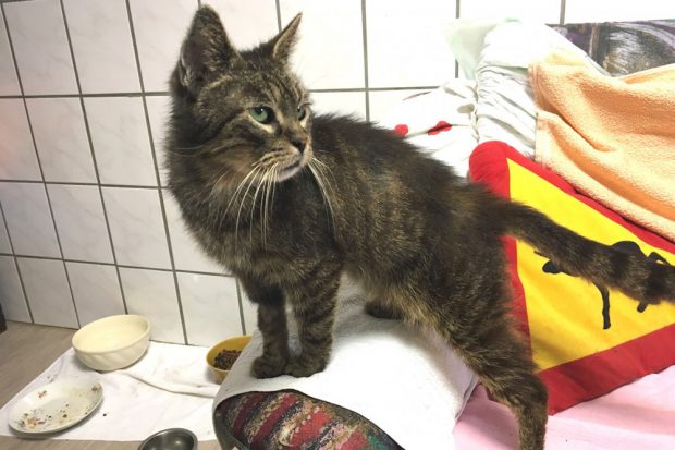 - Ein Kater (männlich kastriert, 12 Jahre alt, Fellfarbe grau-getigert) ist sehr lieb und kontaktfreudig. Aufgrund seines schlechten Pflegezustandes hat er derzeit noch einige kahle Stellen im Fell.