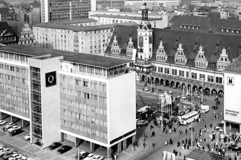 Mit dem Messeamt und dem Messehaus am Markt wurden im Vorfeld der Jubiläumsmesse 1965 auch im Stadtzentrum anspruchsvolle ostmoderne Neubauten errichtet. Parallel dazu erhielten die Eingangsbereiche der Alten Messe ihre markanten Portale in Form des Doppel-M-Messelogos.