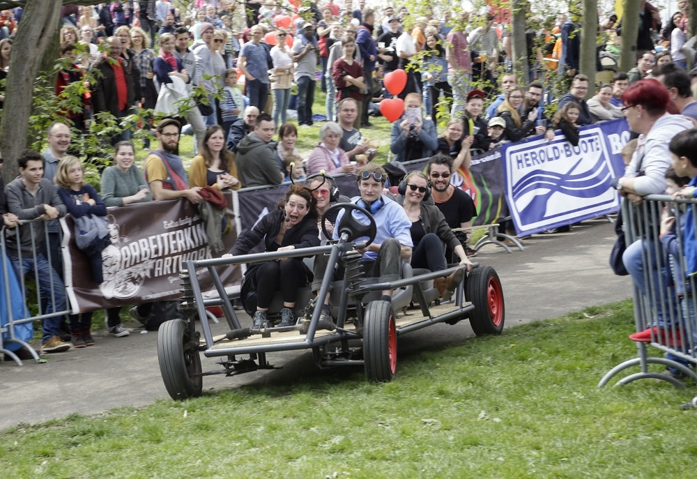 Um 11 Uhr beginnt das Spektakel. Und während am Fuße des Berges das Fockebergfest Fahrt aufnimmt, begeben sich die Seifenkisten an der Bergstraße zum Start: In drei verschiedenen Disziplinen müssen die Teilnehmenden mit ihren verrückten Gefährten überzeugen. Bevor es am Nachmittag den Berg hinunter geht, muss er zunächst samt Kiste gegen die Schwerkraft erklommen werden und in einem Schaufahren oben auf dem Bergplateau gilt es die Mühen der Ebene zu überwinden. Der eigentliche Wettkampf gerät dabei schnell in den Hintergrund – viel zu faszinierend sind die einzigartigen Kisten-Konstruktionen der Bau- und Bastelkünstler, ganz nach dem Motto: Geht nicht gibt’s nicht. Ob als furchtloser Drachenreiter, herunterbretternder Skischanze mitsamt Skispringern als Accessoire, als wilde Rennmaus oder als Rettungshubschrauber, der Fantasie sind beim Seifenkistenrennen keine Grenzen gesetzt, neben Fahrtauglichkeit ist Originalität das größte Ziel!