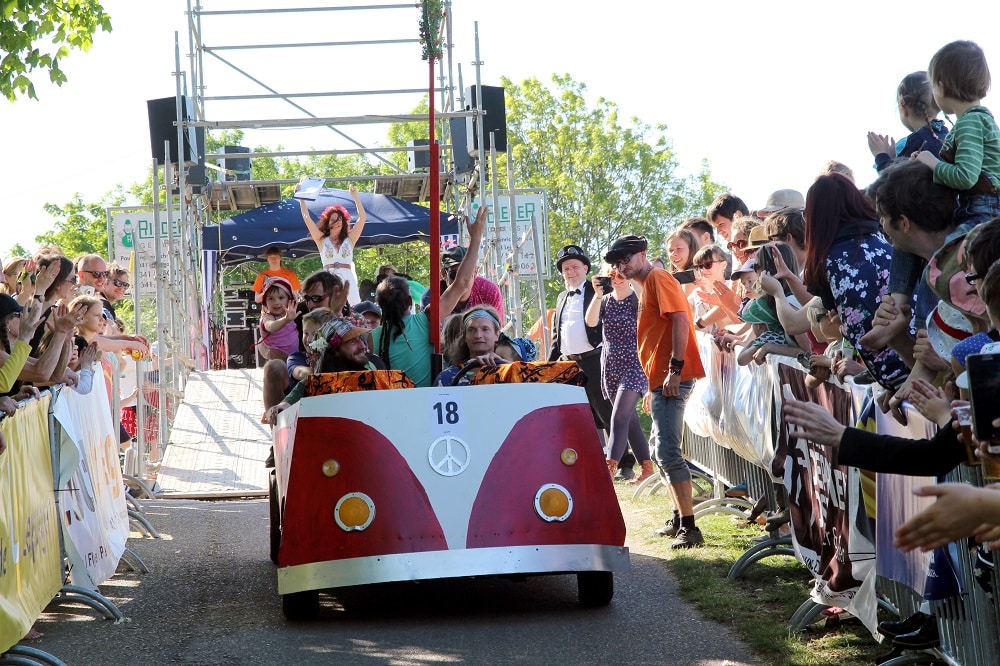 Frei nach der Losung der ‘68er war das Motto des diesjährigen Rennens „Make Soapbox Cars – Not War!“ überall zu spüren. Ob als Kinder anderer Teams und Freiwillige aus dem Publikum den 80-Jährigen Klaus mit seiner Seifenkiste „Der Schuh des Manitu“ in nahezu preisverdächtiger Zeit um den Berg schoben, oder als „die Hippies“ mit endloser Gelassenheit und Seifenblasenschweif um den Berg schwebten.