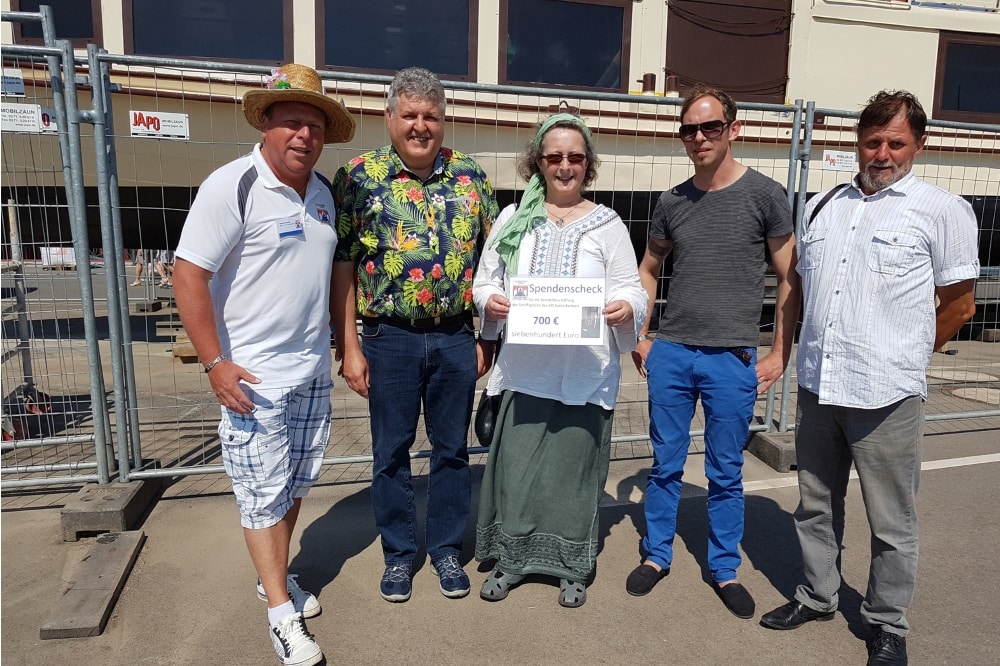 Gegenwärtig liegt sie ja noch auf dem Trockenen (Hintergrund des Fotos). Zum Hafenfest am letzten Sonntag konnte der Vorstand des Wasser-Stadt-Leipzig e.V. (Dr. Sabine Heymann und Frank Fechner) den Spendenscheck an Benedikt Kahlstadt (Geschäftsführer der Sächsisches Seebad Zwenkau GmbH & Co. KG) und Swidbert Scholz (Kapitän der St. Barbara) übergeben. Ein Spender aus Zwenkau war auch mit dabei.