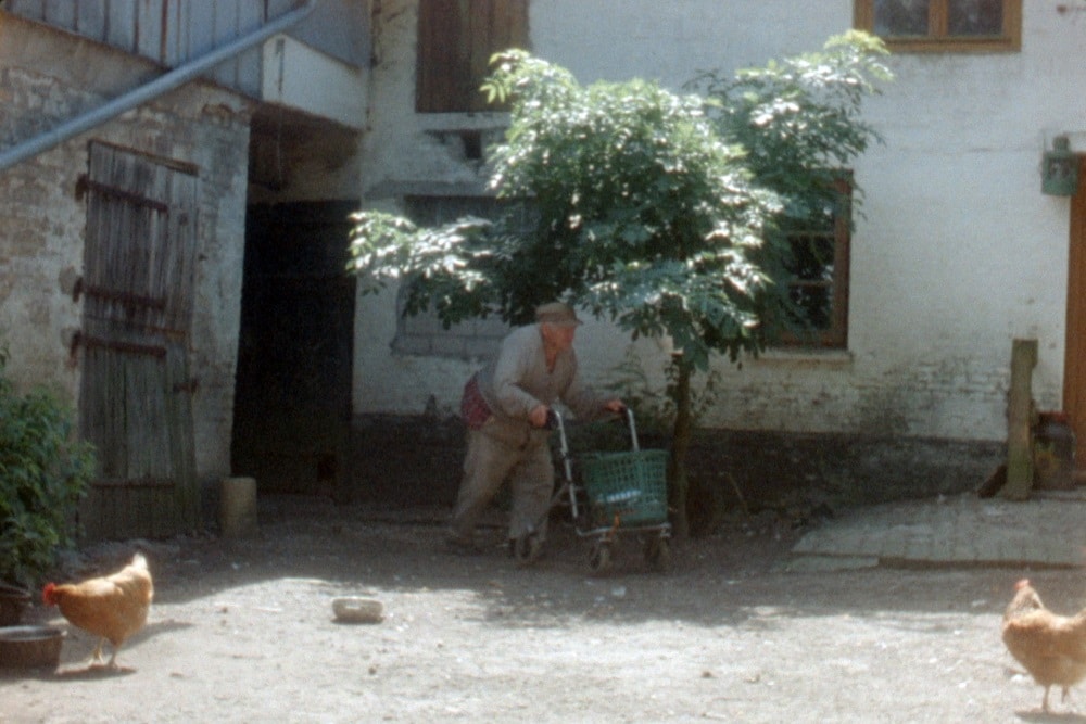 Die Zeit zeigt sich in vielen Gestalten. Der Rollator quietscht spitz, wenn Willi ihn über seinen Hof schiebt, um die Hühner zu füttern. Ein Stuhl steht herum, das Moos schiebt sich an seinem Bein nach oben. Die Nachbarin kommt vorbei und erzählt von einer Goldhochzeit. Im Haus hat schon lange niemand mehr die Blumen gegossen, dafür zieren feine Netze die Blätter. Willis Hände zeugen von einem arbeitsamen Leben. Sie fahren durch das Fell der dösenden Katze, deren Schnurren den Raum erfüllt. Langsam die Bewegungen, er hat Zeit. Das Filmmaterial gibt einen Rhythmus vor, die 16mmund Super8-Kameras beschränken die Dauer der Einstellungen.