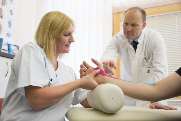 Natürlich können auch Ergotherapeuten helfen, wie Norina Weisenbilder von der Zentralen Einrichtung Physikalische Therapie und Rehabilitation am UKL. Die 34-Jährige kennt das Problem: „An jeder Haltestelle sehe ich meine künftigen Patienten stehen – Kopf geneigt, Rundrücken und den Daumen immer in Bewegung. Auf Dauer sind dann Muskelverspannungen die logische Folge. Erst der große Daumenbeuger, dann der Unterarm, die Schulter, der Nacken.“ Ergo- und Physiotherapeuten beherrschen Techniken, mit denen Faszien, Muskeln und Bindegewebe gelöst werden. Auch ein Kinesio-Tape am Daumensattelgelenk und an der Daumenseite des Unterarms hilft, den langen Daumenbeuger zu stabilisieren.