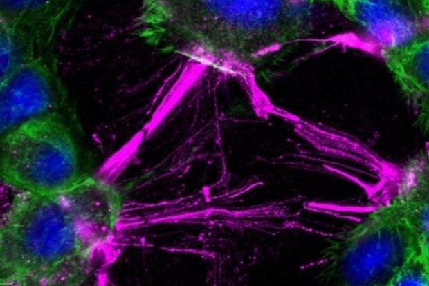 Mikroskopisches Bild von Zellen, die mechanischen Scherkräften ausgesetzt wurden. Die Zellen (blau: Zellkern, grün: Aktin-Zellskelett) verändern ihre Form, ziehen sich zusammen und lösen ihre Kontakte. Der Rezeptor CD97 wird in Fasern der kontrahierenden Zellen phosphoryliert (magenta).