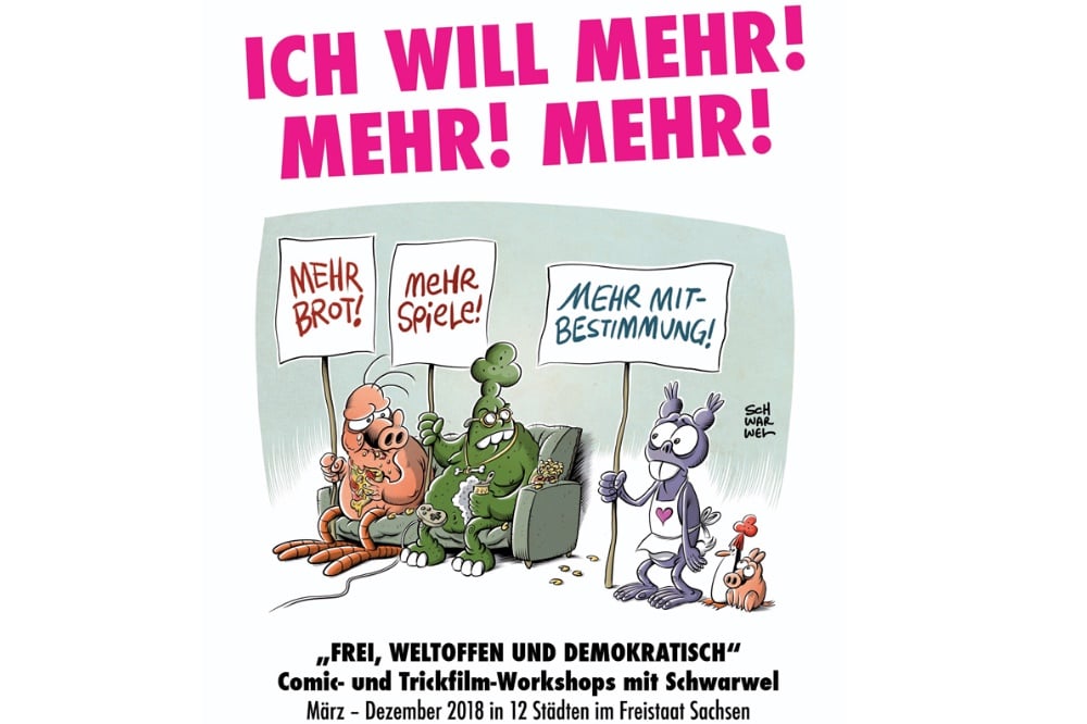 Am 28.09. startet der Comic-/Trickfilm-Workshop-Demokratie-Sachsen-Tour zur Demokratiebildung und Förderung der demokratischen Kultur im Jahr 2018 in Grimma und endet am 08.12. in Rodewisch. Die Teilnehmer*innen und Workshop-Orte sind bunt gemischt: Berufsschulen, Schulen, ein Hort, sozio-, kulturelle und Frauenzentren.