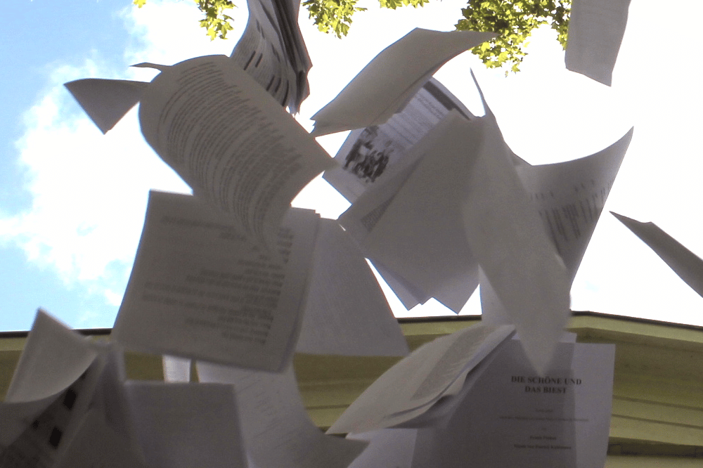 Flugblätter fliegen von der Ballustrade des Theater für Niedersachsen auf den Platz nieder. Rüya Gürcan, André Trzewik und Birte Freimann strecken ihre Hände nach oben, um weitere Blätter in den Spätsommerhimmel von Hildesheim zu werfen. Die drei sind ein Teil des Jungen Ensembles des Theater für Niedersachsen.