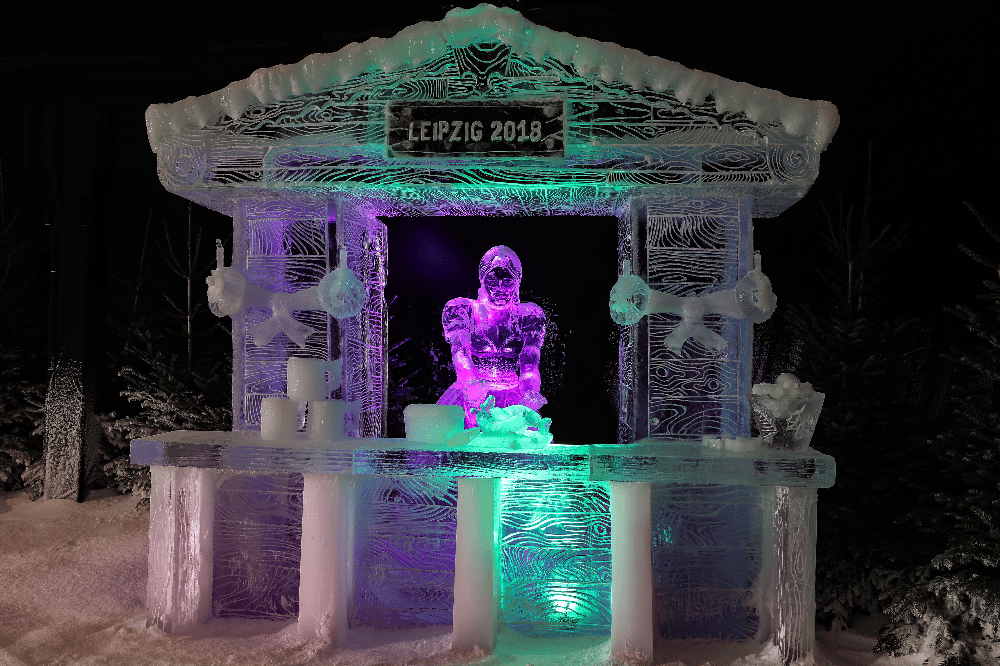 Über 200 Tonnen Eis und 200 Tonnen Schnee benötigten die Eis-Profis für ihre filigranen Kreationen. Viele Ideen für die Eis-Skulpturen entstehen erst vor Ort: „Besonders reizvoll ist es für uns, bekannte Symbole der Stadt in die Ausstellung zu integrieren. Da fiel uns in einer so geschichtsträchtigen Stadt wie Leipzig die Auswahl recht schwer“, erklärt Martin de Zoete, künstlerischer Leiter der Eiswelt Leipzig. Beispielsweise erstrahlen das bedeutende Völkerschlachtdenkmal, der Leipziger Zoo und der wunderbare Bayerische Bahnhof selbst in Eis und Schnee.