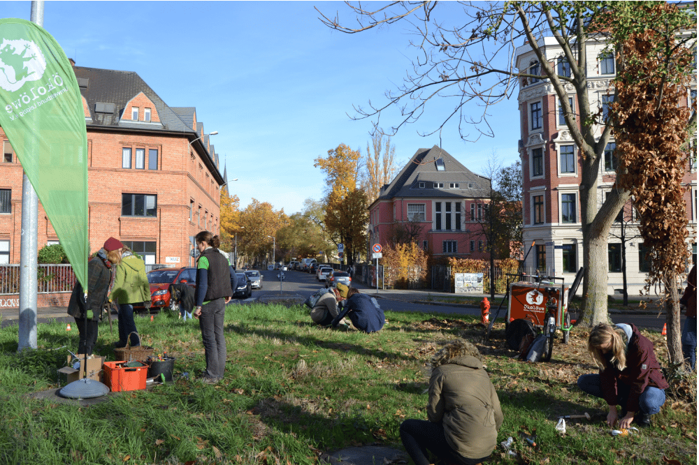 Rund 600 Blumenzwiebeln haben die Ökolöwen am Samstag, den 10. November, gemeinsam mit engagierten Anwohnerinnen und Anwohnern auf der Verkehrsinsel an der Kreuzung Industriestraße/ Erich-Zeigner-Allee in den Boden gesteckt. Krokus, Traubenhyazinthe und Blaustern warten nun auf den Frühling.