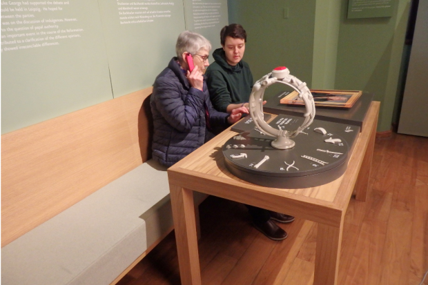 Taktile Elemente weisen auf die Hörtexte hin, die sowohl den Ausstellungsteil zur Reformation mit einzelnen wichtigen Objekten als auch die Tastmodelle ausführlich bildhaft beschreiben und erläutern.