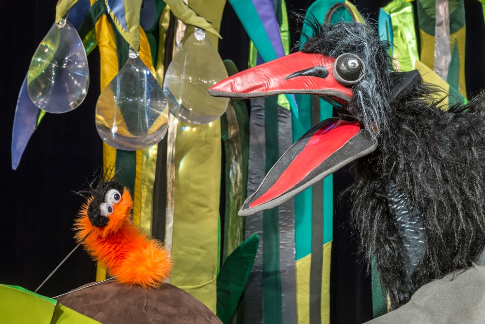 Auf der Bühne ranken sich menschenhohe wilde Gewächse, fantasievolle Blumen und liebevoll gestaltetes Blattwerk aus bunt glänzenden Stoffen. Die kleine Raupe weiß nicht mehr weiter und beschließt sich zu verstecken. Gefühlvoll untermalt wird das Geschehen von Trommelschlägen und Xylophonklängen, die ein Musiker live auf der Bühne hervorbringt.