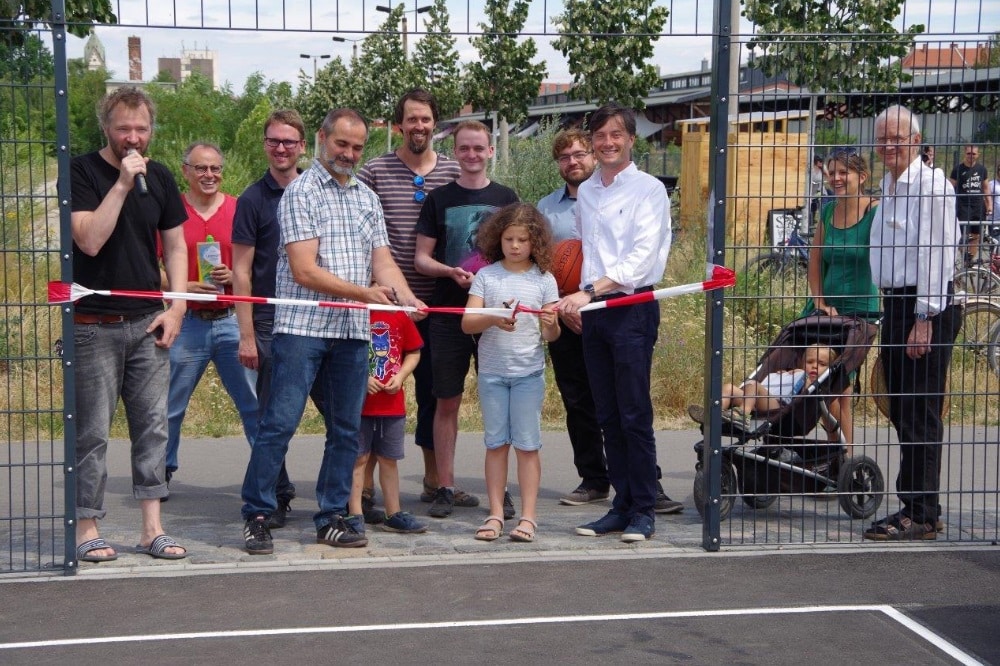 Gemeinsam feierten die Stadt Leipzig vertreten u.a. durch Bürgermeister für Umwelt, Ordnung und Sport Heiko Rosenthal, das Planungsbüro Spiel.Raum.Planung und dem BürgerInnenverein GleisGrün e.V. am 06.07.2019 die Eröffnung des neuen Ballspielfeldes auf dem ehem. Güterbahnhof Plagwitz. Das neue Ballspielfeld liegt direkt neben den Bauspielplatz und den Hildegärten und beherbergt einen Streetballkorb, einen Streetsoccerplatz und sogar ein Volleyballfeld.