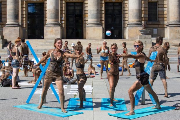Vor dem Leipziger Bundesverwaltungsgericht stellten die Initiatoren typische Strandszenen nach: Entspannen im Liegestuhl, Beach- und Federball spielen, Muscheln sammeln und Sandburgen bauen. Eigentlich nichts Ungewöhnliches mitten in der Urlaubssaison. Allerdings: Die „Urlauber“ waren komplett mit Matsch bedeckt.