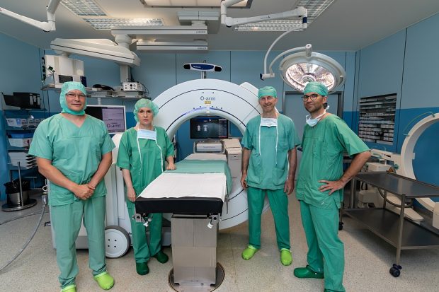 Der O-Arm, ein 800kg schweres, chirurgisches Bildgebungssystem erleichtert nun die Arbeit von Dr. Böhme und seinem Team. In jeder Phase des Eingriffs an der Wirbelsäule kann sich der Operateur ein dreidimensionales Bild der operierten Körperpartie machen. Anders als ein herkömmlicher Computertomograf kommt der O-Arm zum Patienten – nicht umgekehrt.