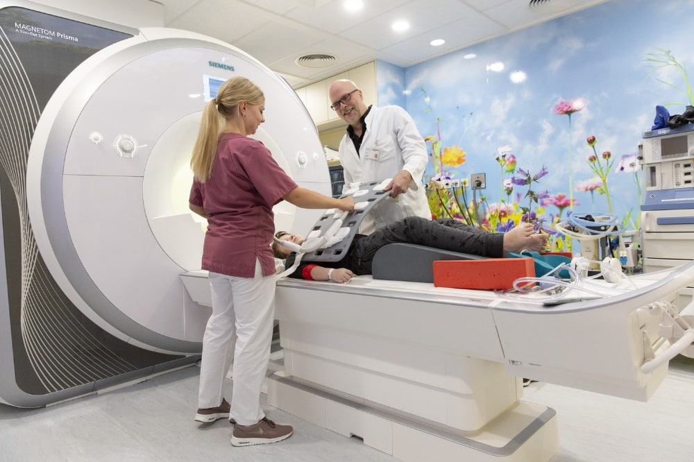 Kinder ab Sechs können sich nun vor der Untersuchung aus einer Auswahl zum Beispiel einen Animationsfilm wählen. Dieser läuft dann im Untersuchungsraum als Videoprojektion an einer Seitenwand. Die übrigen Wände ringsum sind als farbenfrohe Blumenwiesen gestaltet, die Raumdecke ziert ein so genannter Lichthimmel. Dieser vermittelt das Gefühl, in die Wolken zu schauen und nimmt so dem Raum eine mögliche gefühlte Enge.