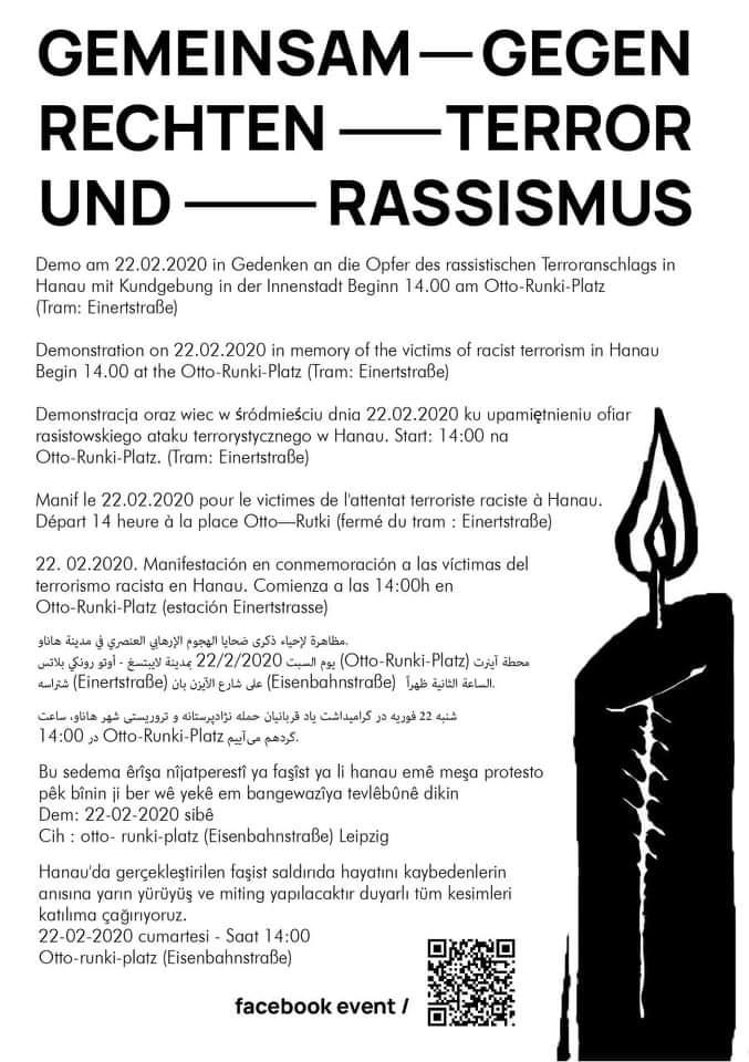 Am heutigen 22.02.2020 findetĀ eine Demonstration in Gedenken an die Opfer des rassistischen Terroranschlags in Hanau mit Kundgebung in der Innenstadt statt. Unten finden Sie den Flyer in mehreren Sprachen.