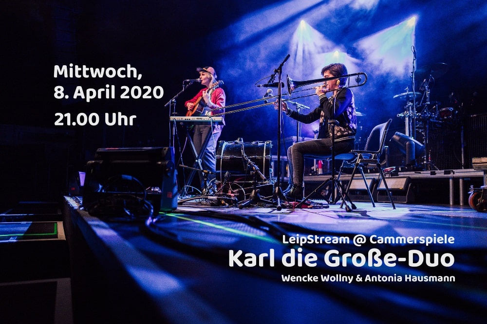 Am Mittwoch, 08. April 2020, 21 Uhr sendet LeipStream das erste Mal live aus den Cammerspielen (Kochstraße 132, 04277 Leipzig) und es wird gemütlich! Wir freuen uns auf das Konzert mit dem Karl die Große-Duo im kleinen, intimen und Corona-konformen Setting.