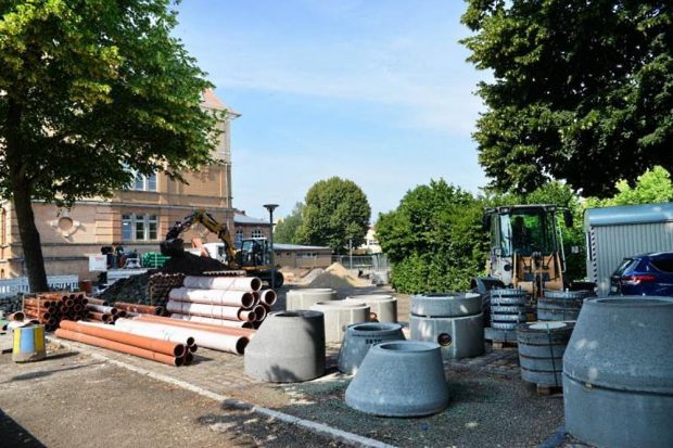 Auf dem Schulhof der Grundschule Diesterweg in Delitzsch haben die ersten Bauarbeiten im Zuge der grundhaften Sanierung begonnen.