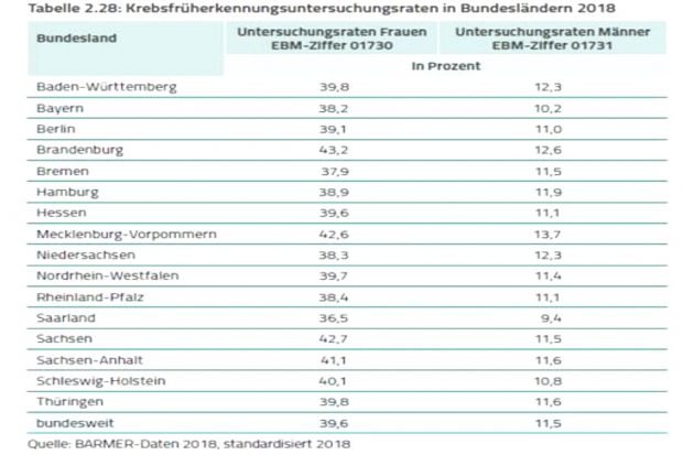 Bei der Inanspruchnahme von Früherkennungsuntersuchungen weisen die Daten der BARMER regionale Unterschiede aus. In den neuen Bundesländern sind die Untersuchungsraten im Schnitt höher. Mit 42,7 Prozent bei der Krebsfrüherkennung liegen die Sächsinnen deutschlandweit im oberen Mittelfeld. Bei den Männern nutzen allerdings nur rund 12 Prozent die Krebsfrüherkennungsuntersuchung. „Leider sind Männer noch immer Vorsorgemuffel. Sie sollten sich an den Frauen ein Beispiel nehmen“, so Magerl.