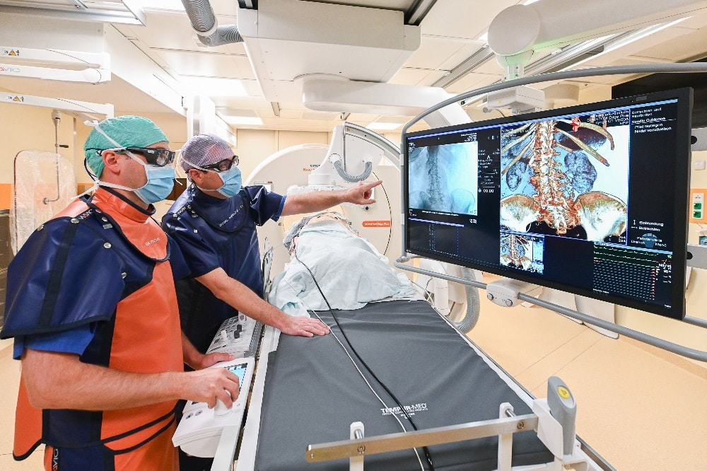 Herzstück bildet das Nexaris Angio-CT, ein technisch hochspezialisiertes Gerät, dass die Vorteile der Angiografie und Computertomografie kombiniert, wie Priv.-Doz. Dr. Moche, Chefarzt der Klinik für Interventionelle Radiologie, erklärt: „Durch das Angio-CT ist eine einzigartige Bildgebung möglich, die uns zukünftig eine deutlich verbesserte Kontrolle des Eingriffs garantiert. Mit der Angiografie lassen sich die Gefäße im Körper durch Zugabe eines Kontrastmittels in Echtzeit auf dem Monitor zweidimensional sichtbar machen.