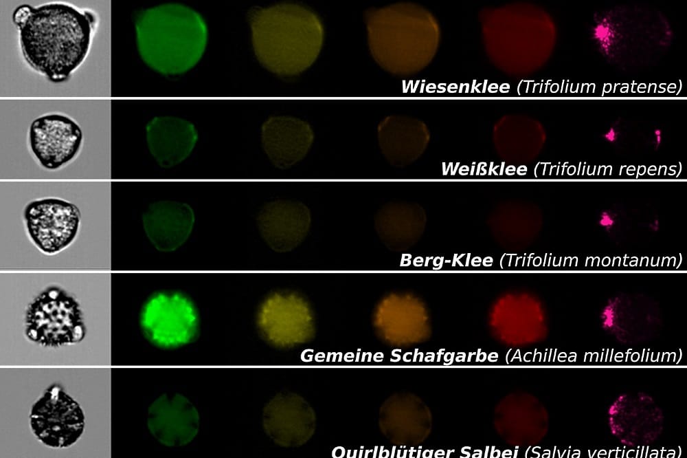 Die in der New Phytologist-Studie untersuchten Pollenproben stammten von 35 Wiesenpflanzenarten, darunter zum Beispiel Schafgarbe, Salbei, Thymian und verschiedene Klee-Arten wie Weiß-, Berg- und Wiesenklee. Insgesamt fertigten die Forscher rund 430.000 Bilder an, die den Grundstock für eine Datenbank bildeten. Diese wurde in Kooperation mit der TU Ilmenau mittels Deep Learning in ein hocheffizientes Werkzeug zur Pollenidentifizierung überführt.
