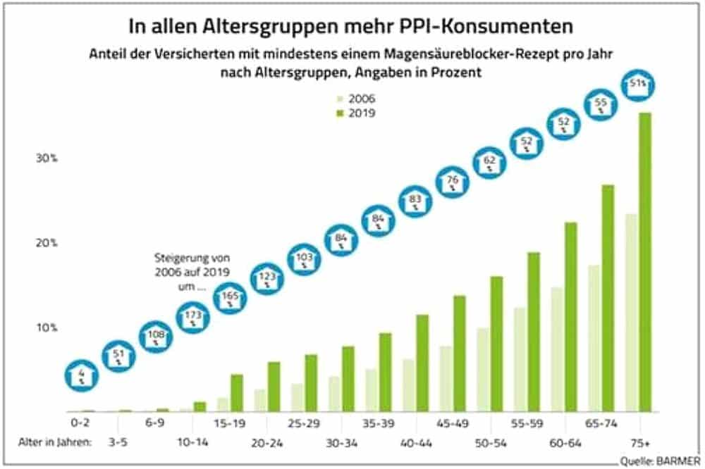 Hier sei die Anzahl der Verordnungen entgegen dem Trend deutlich gestiegen. Aus Sicht der BARMER würden dennoch insgesamt deutlich zu viele Magensäureblocker verschrieben. Die immer noch sehr hohen Verordnungsraten sind rein medizinisch oder demografisch nicht erklärbar.