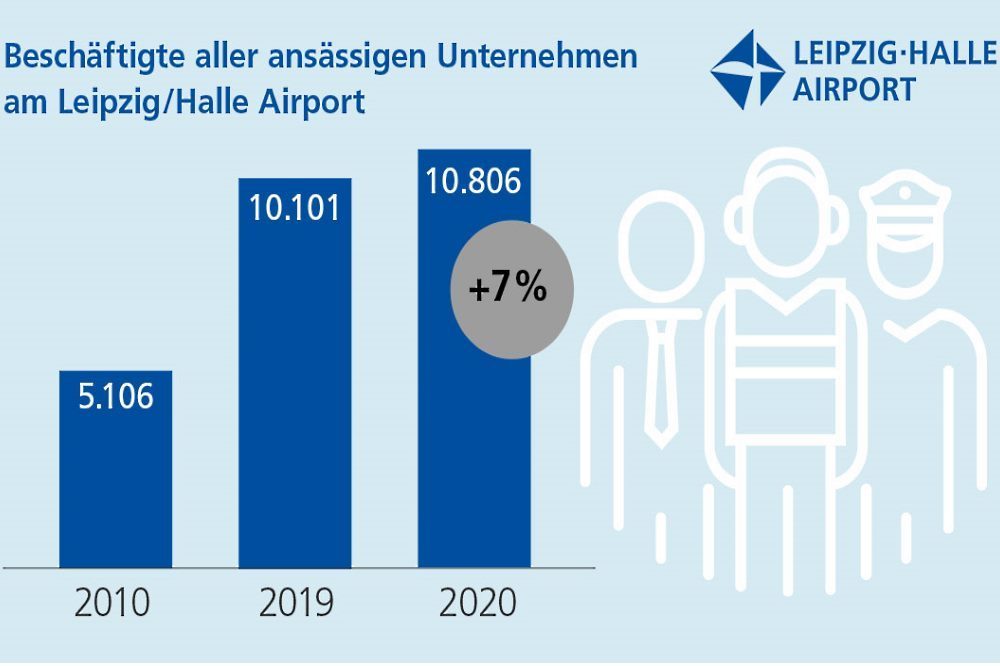 Der Flughafen Leipzig/Halle (LEJ), Europas viertgrößter Fracht-Airport, hat 2020 die Zahl seiner Beschäftigten um 7 Prozent auf 10.806 gesteigert. Im Vergleich zu 2010 hat sich die Anzahl der Erwerbstätigen damit mehr als verdoppelt. Deutliche Zuwächse verzeichnen besonders die Bereiche Frachtumschlag, Fracht-Fluggesellschaften, Logistik und Speditionen. Gegenüber 2019 stieg die Zahl der in diesen Branchen Beschäftigten am LEJ um 11 Prozent auf rund 8.200.