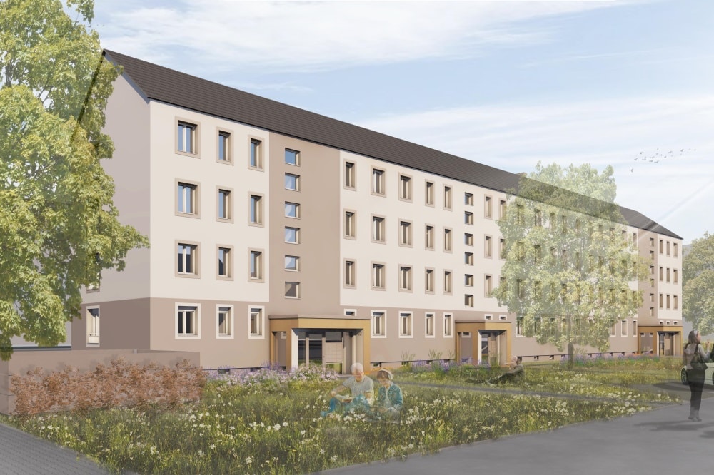 Auch die Bereiche vor und hinter den Häusern sollen umgestaltet werden. So entstehen 20 PKW-Stellplätze, Fahrradbügel sowie ein abschließbarer Containerplatz mit Abstellmöglichkeiten für Fahrräder. Ende 2022 soll der Umbau fertig sein.
