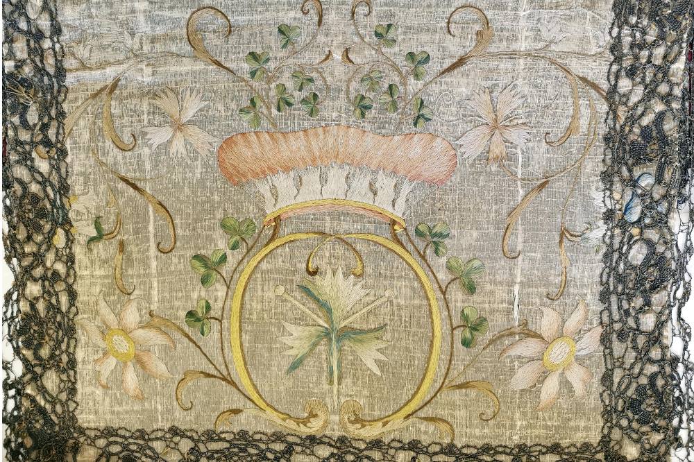 Ein hauchdünner barocker Seidenstoff, 46 x 59 Zentimeter, ist mit zartfarbenen Seidenfäden bestickt und mit einer jüngeren, gröberen Silberspitze eingefasst. Im Zentrum der Seidenstickerei stehen die zwei miteinander verschlungenen Buchstaben „C“. Als Anfangsbuchstaben von Christian und Christiana von Sachsen-Merseburg symbolisieren sie die tiefe Verbundenheit des Fürstenpaares.