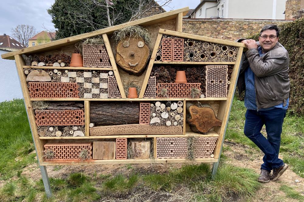 Gebaut hat Daniel Grahl das Insektenhotel gemeinsam mit einem Freund. „Uns war wichtig, dass das Insektenhotel optisch etwas her macht, groß genug ist und natürlich eine Menge Unterschlupfmöglichkeiten für die vielen verschiedenen Arten bietet“, sagt der Kinobetreiber. So könnten verschiedene Bienenarten wie Maskenbienen, Blattschneidebienen, Mauerbienen sowie verschiedene Wespenarten, aber auch Fliegen, Ohrwürmer, Marienkäfer und Schmetterlinge Platz darin finden.