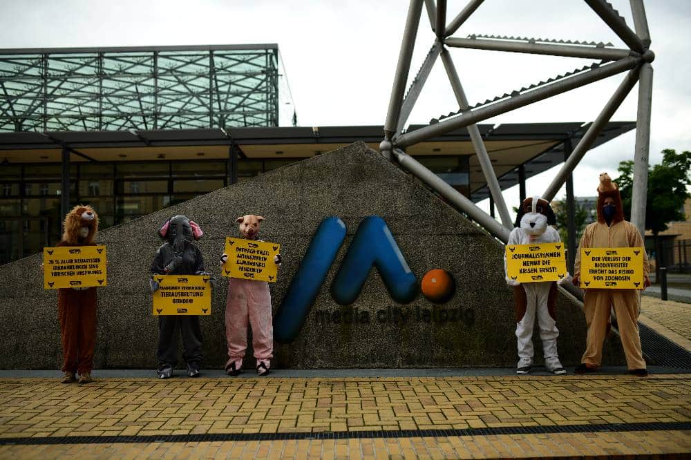 Sinnbildlich verkleidet als Tiere stellen sich die Protestierenden vor dem Medienhaus auf und fordern auf Schildern: „Journalist/-innen nehmt die Krisen ernst“. Außerdem wird die „Dreifach-Krise Artensterben Klimawandel Pandemien“ benannt und aufgeklärt: „Der Verlust der Biodiversität erhöht das Risiko von Zoonosen“. Ein weiteres Schild zeigt: „Pandemien verhindern: Tierausbeutung beenden!“.