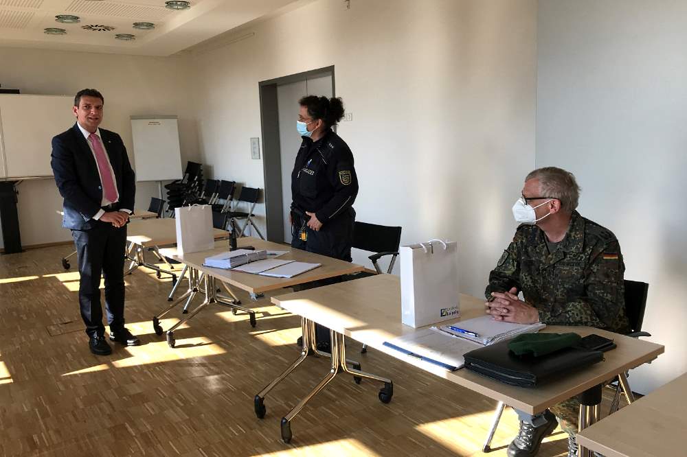 Landrat Graichen dankte der Verbindungsbeamtin der sächsischen Polizei für ihre Arbeit und den Informationsaustausch im Infektionsstab des Landkreises. Das gelte ebenso für den Verbindungsbeamten zur Bundespolizei für den Bereich der Reisenden.
