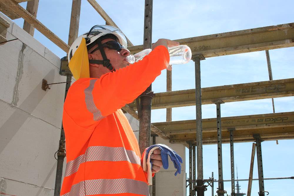In diesen Tagen klettert das Thermometer in vielen Teilen Deutschlands nach oben. Hitze belastet den Kreislauf und hochsommerliche Temperaturen machen die Arbeit schwerer, besonders auf dem Bau. Hinzu kommt im zweiten Pandemie-Sommer die Maskenpflicht zum Schutz vor Corona. Das kann bei körperlich schwerer Arbeit eine zusätzliche Strapaze für den Kreislauf sein.