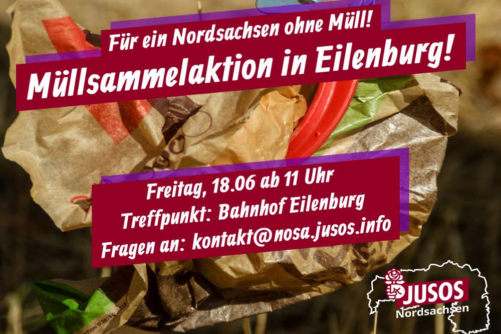 Die Jusos Nordsachsen planen in den kommenden Monaten mehrere Müllsammelaktionen im gesamten Landkreis. Die erste soll am 18.06 ab 11 Uhr in Eilenburg stattfinden. Weitere Aktionen in anderen Städten wie Torgau, Taucha, Delitzsch, Schkeuditz oder Oschatz sind in Planung.