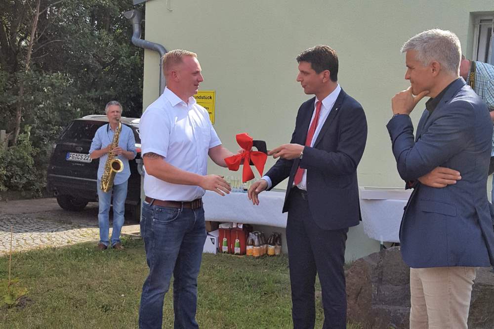 Die offizielle Übergabe des Schlüssels der Rettungswache durch Landrat Henry Graichen an den Leiter der Rettungswache Ragewitz, Bill Seifert, fand am 27.07.2021 statt.