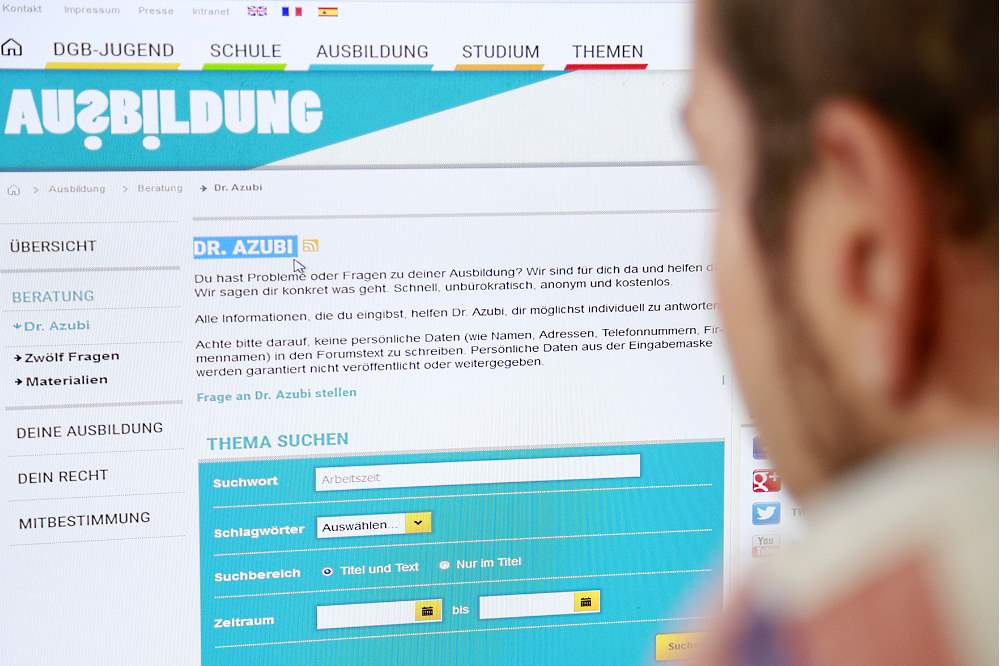 „Dr. Azubi“ ist die Online-Sprechstunde der DGB-Jugend. Der Service ist rund um die Uhr erreichbar. Die Antworten kommen je nach Branche von Experten der zuständigen Gewerkschaft – in der Regel spätestens nach einem Tag.