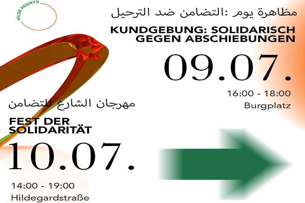 Fest der Solidarität am Sa, den 10.07.2021, Hildegardstraße 14 – 19 Uhr: Wir laden euch am 10. Juli zu einem Fest der Solidarität auf der Hildegardstraße ein. Wir wollen Raum schaffen für Austausch über Supportstrukturen, für Wut, für Solidarität und für ein Zusammenkommen!