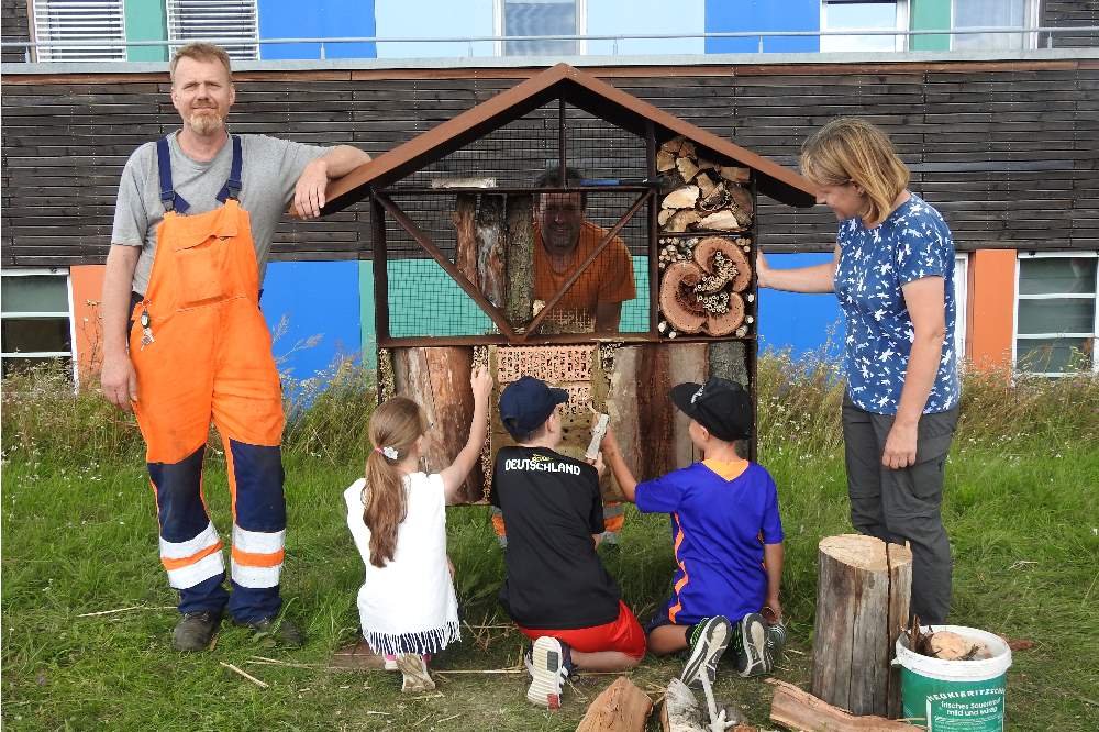 Das Gerüst für das Insektenhotel hat Stefan Hennig (WEV) vorab mit gebrauchten Stahlbohlen aus der Intensivrotte der Mechanisch-Biologischen Abfallbehandlungsanlage gebaut. Neben Ladesäulen aus diesem Material, Papierkörben und Bänken, ein weiteres Upcyclingprojekt der Westsächsischen Entsorgungs- und Verwertungsgesellschaft (WEV). Gemeinsam mit der NFG Ökologischen Station Borna-Birkenhain, dem ZAW und der WEV wurde dieses Ferienprojekt initiiert.