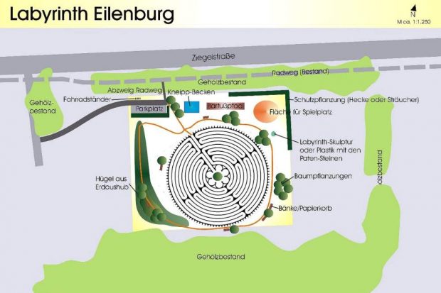Interessante Effekte gäbe es auch noch, so könnte ein Teil des Erdaushubes von dem neu entstehenden Gelände von EDEKA einen kleinen Hügel ergeben, von dem man einen schönen Blick auf das Labyrinth und die „neue“ Mitte genießen könnte.