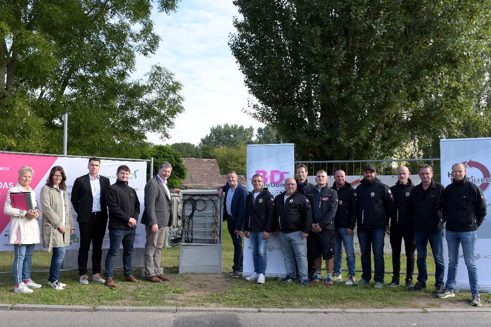 Gemeinsam mit dem Oberbürgermeister der Stadt Delitzsch, Dr. Manfred Wilde, und Vertretern der Telekom bedankte sich der 1. Beigeordnete des Landrats bei den Mitarbeitern der Firma Bergert Hoch und Tiefbau für den reibungslosen Ablauf. In Delitzsch kommen bis Jahresende 3.900 Haushalte ans Netz. Dafür mussten mehr als 1.200 Hausanschlüsse und 60 Netzverteiler neu gesetzt werden. In den Stadteilen Schenkenberg, Rödgen und Delitzsch sind die Glasfaseranschlüsse bereits teilweise buchbar, fortlaufend kommen weitere Abschnitte hinzu.