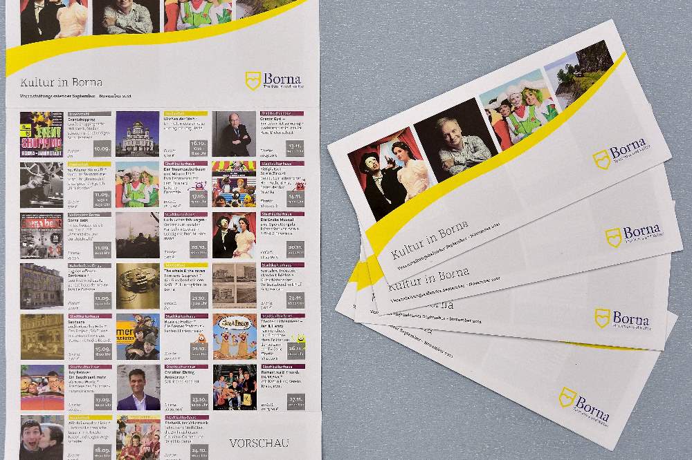 Der neue Kulturkalender der Stadt Borna ist da und informiert über das abwechslungsreiche Kulturprogramm unserer Stadt. Hier finden Sie alle Informationen zu Konzerten, spannenden Vorträgen, lustigen Comedy-Abenden oder Filmveranstaltungen übersichtlich und auf einen Blick.