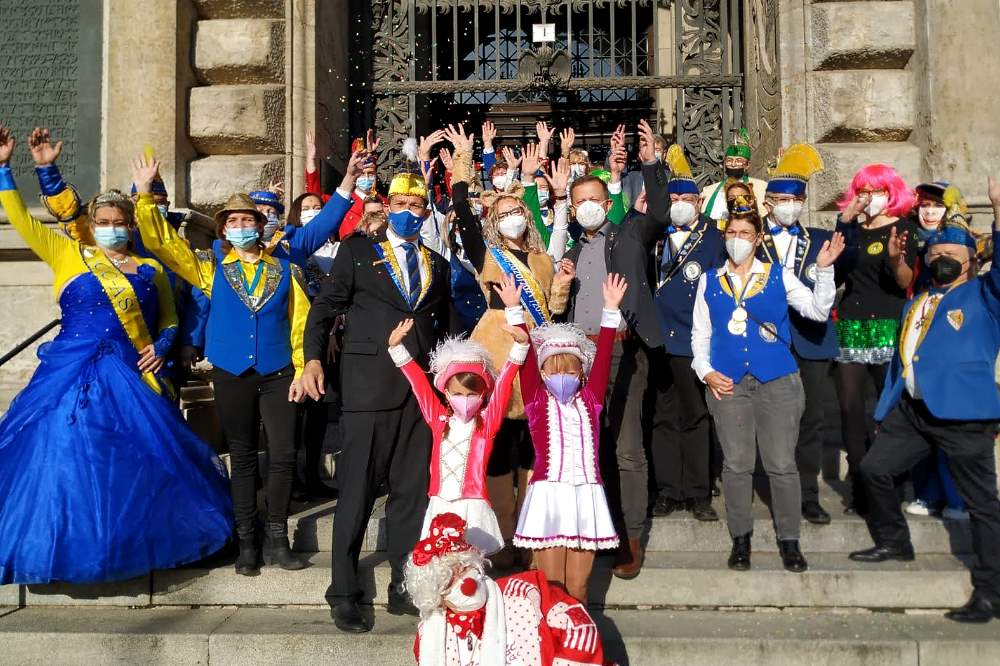 Dieses Jahr kam zum ersten Mal zur Schlüsselübergabe Herr Bonew, Bürgermeister für Finanzen. Doch aufgrund der Sparmaßnahmen hatte er nur einen kleinen Schlüssel im Gepäck. Gemeinsam läuteten die Karnevalisten und Löwin Leila die 5. Jahreszeit ein.
