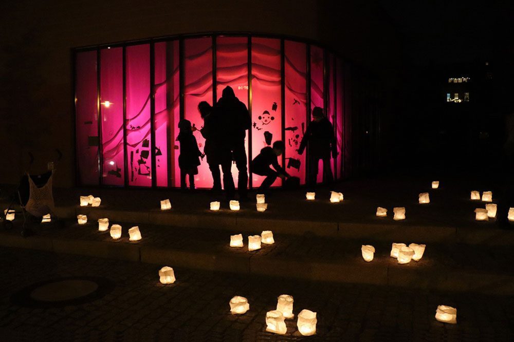 Auch beim Buchkinder Leipzig e. V., der den BuchKinderGarten in der Josefstraße 11 in farbiges Licht tauchen wird. In den Foyerfenstern der KITA entsteht ein Schattenbild. Wir laden euch herzlich ein, am 4. Dezember vorbeizukommen und eure eigenen Schattenbildgestalten vorbeizubringen, die wir für euch zum Bild dazugesellen.