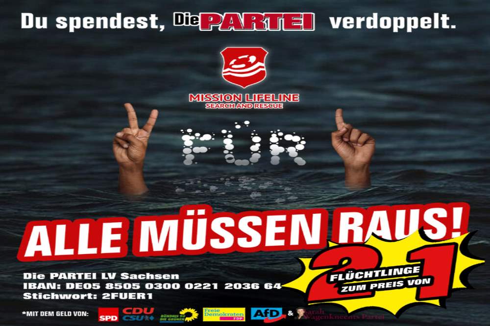 Die PARTEI möchte für die Dresdner Seenotrettungs-NGO MISSION LIFELINE spenden und bittet um Ihre Unterstützung. Wenn Sie uns spenden, dann können wir, unseriöser Parteienfinanzierung sei Dank, jeden Euro verdoppeln! Also seien Sie dabei, wenn es heißt: „2 Flüchtlinge zum Preis von 1“